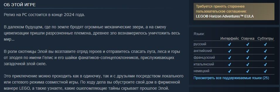 В середине июня Sony открыла страницу игры LEGO Horizon Adventures в Steam. Из неё стало известно, что новый проект PlayStation получит полноценный перевод на русский язык — субтитры и дубляж. Проект также получил локализованное название в странах СНГ — «LEGO: Приключения Horizon»